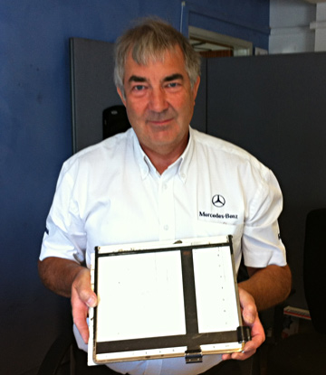 Ground Control and I are going back to Kidderminster tomorrow to pick up the Sprinter (still loaded up with Chattie) after its service. A rather expensive service, as it turns out, but at least we know the Sprinter is good and roadworthy. We had to take it to the Mercedes-Benz dealer, and as I chatted to their Service Advisor, Andrew Brown, he said, ‘My father was in the RAF, too’. Turns out his father, Thomas Royster ‘Roy’ Brown, was a Ground Crew engineer with one of the reconnaissance squadrons. ‘In fact,’ said Andrew, ‘It’s funny you should come today, because I’ve got this with me; it’s from a Spitfire’ and he reached down beside the desk and picked up a piece of equipment that looked like something you might use for technical drawing. See photo: