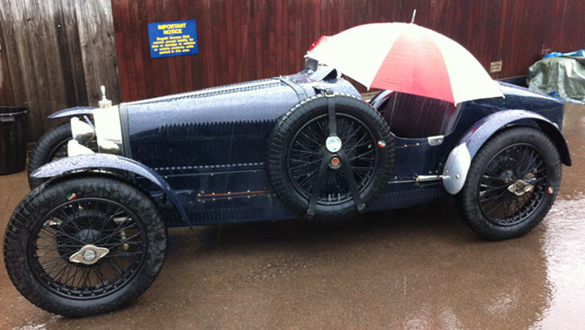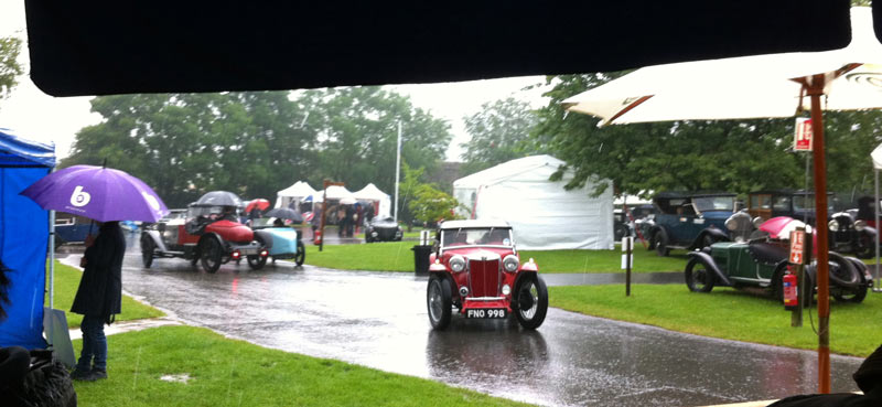 Pre-War Prescott exhibitd some measure of the spirit of the blitz on Saturday (19th July) as rain lashed down to the accompaniment of thunder and lightning. I arrived on site at around 9.00 with Chattie strapped onto the back of the carrier, thinking that pre-war cars would be a bit short on the ground with the monsoon conditions, but they came pouring in – literally – through the gate, many driven some miles without all-weather hoods. By the time I had unloaded Chattie, with the help of my cousin Alan, I was soaked through to my skin through my rain coat and trousers, and if he hadn’t lent me another one of his, the top half of me would have been drenched as well. Thank you so much, Alan!