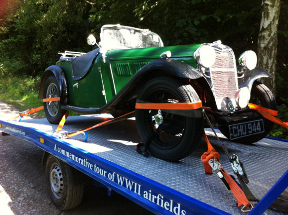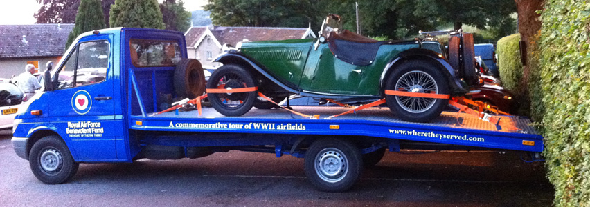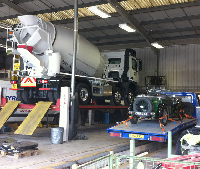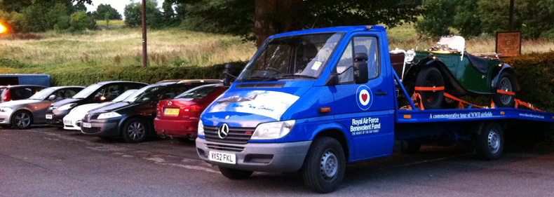 As a matter of record, it took me 1 hour 45 minutes to get Chattie onto the back of the Sprinter and firmly tied down, at the end of Pre-War Prescott. Working on my own, it’s hard work, but this was always part of the challenge. We have some modifications to make to the rig, which will make it easier, like loops to go round the wheels instead of wrapping the webbing round. But here, for the record, is the result, which I’m glad to say lasted the whole way home. Here Chattie is shown still tied down on the way to Rygor’s of Kidderminster, for the Sprinter to have its service. Easier to leave Chattie on the back, after all that effort. Here I’m showing off my finished rigging. Not the best, perhaps, but MY best!