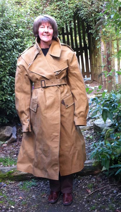Elizabeth is modelling Ground Control’s proposed solution to wet-weather driving without a hood: a World War I (we think) dispatch rider’s coat, which belonged to GC’s late brother, who probably bought it at a classic car auction somewhere in the dim and distant past. It’s so stiff and heavy it virtually stands up on its own. It smells of old canvas. The sleeves come almost to her knees. Elizabeth refuses to wear it for driving, and thanks Liz Heyer for her excellent alternative suggestions!